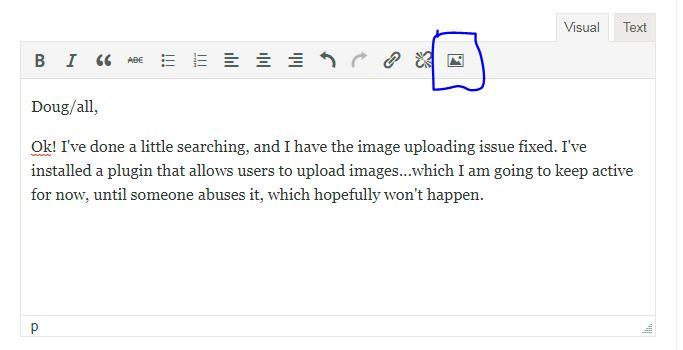 Ok! I’ve done a little searching, and I have the image uploading issue fixed. I’ve installed a plugin that allows users to upload images…which I am going to keep active for now, until someone abuses it, which hopefully won’t happen.