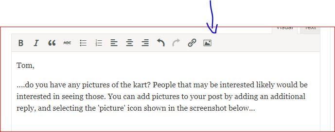 ….do you have any pictures of the kart? People that may be interested likely would be interested in seeing those. You can add pictures to your post by adding an additional reply, and selecting the ‘picture’ icon shown in the screenshot below…